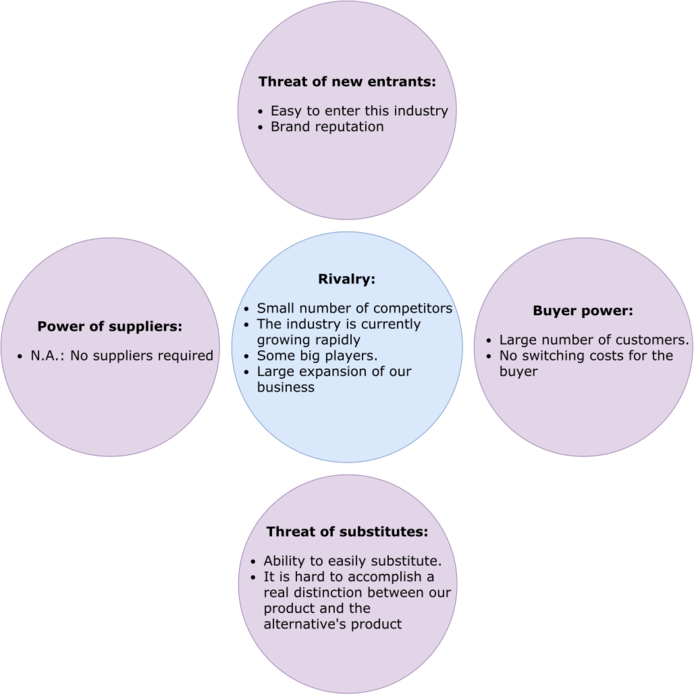 • In this section, we think that the most important threat is the facility to enter in the industry. A company that is looking to enter this market, would have to invest mostly in HR. There are a lot of free technologies that can be implemented to start developing the project before is ready to be launched into the market.
