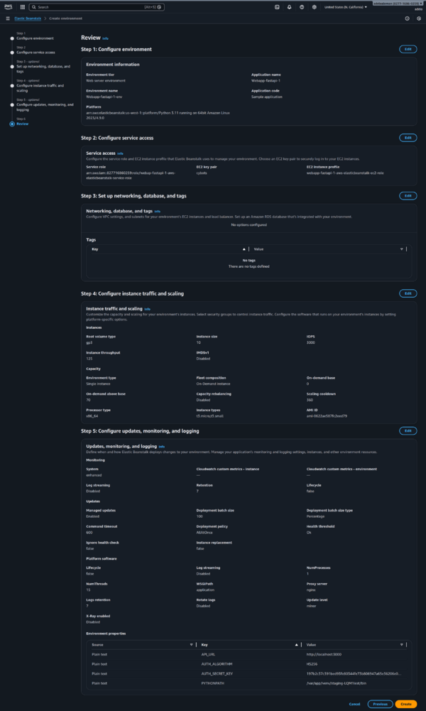 - Environement: webapp-fastapi-1.us-west-1.elasticbeanstalk.com
